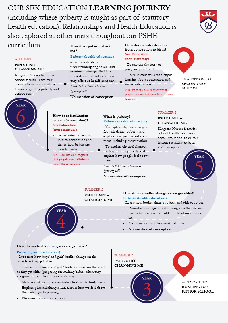 Please see the learning journey below for more information about what is covered as part of pupils' learning about puberty (statutory health education) and non-statutory sex education lessons about conception. As a school, we are deeming the content which is highlighted in red text as sex education because it covers human reproduction. Children can be withdrawn from lessons which cover the sections highlighted in red text. Please see our RSHE Policy for more information.